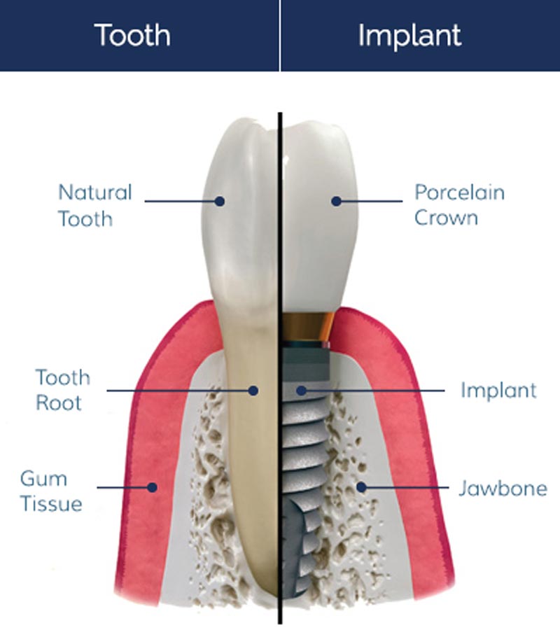 Implant dentistry involves replacing a missing tooth (or teeth) with a dental implant. The Dental implant is an artificial tooth root made of titanium that is surgically inserted into your jaw. This titanium rod is biocompatible so there is minimal risk of your body rejecting it.